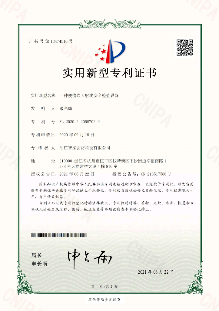 防輻射安檢裝置專利證書